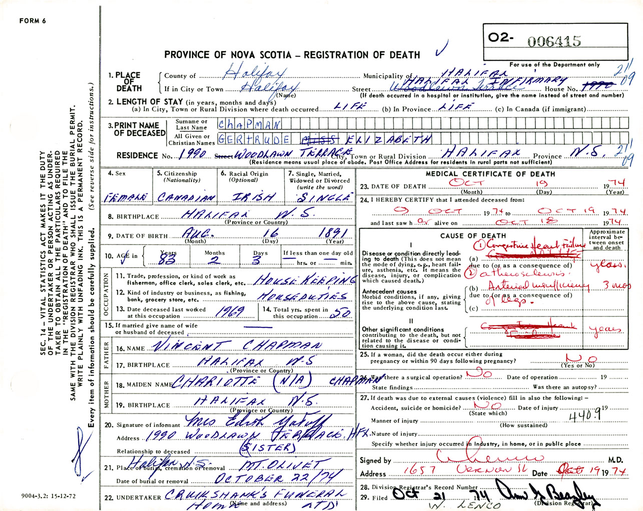 Female Death Registration: Year: 1974 number: 6415