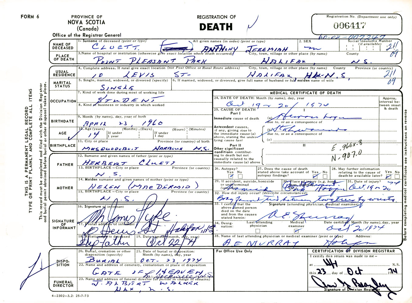 Male Death Registration: Year: 1974 number: 6417
