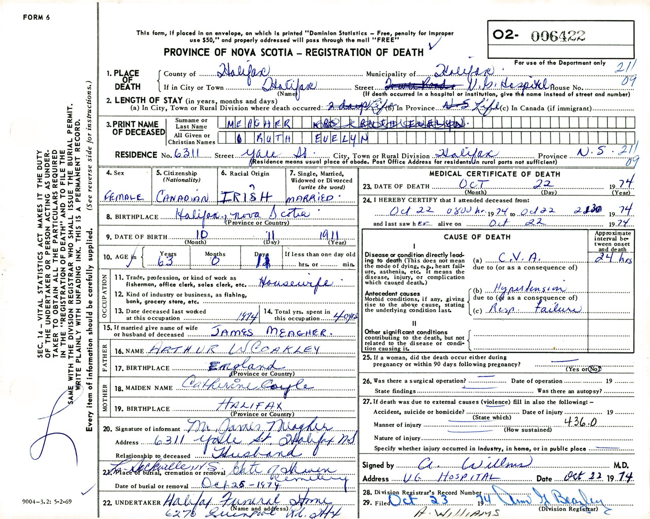 Female Death Registration: Year: 1974 number: 6422