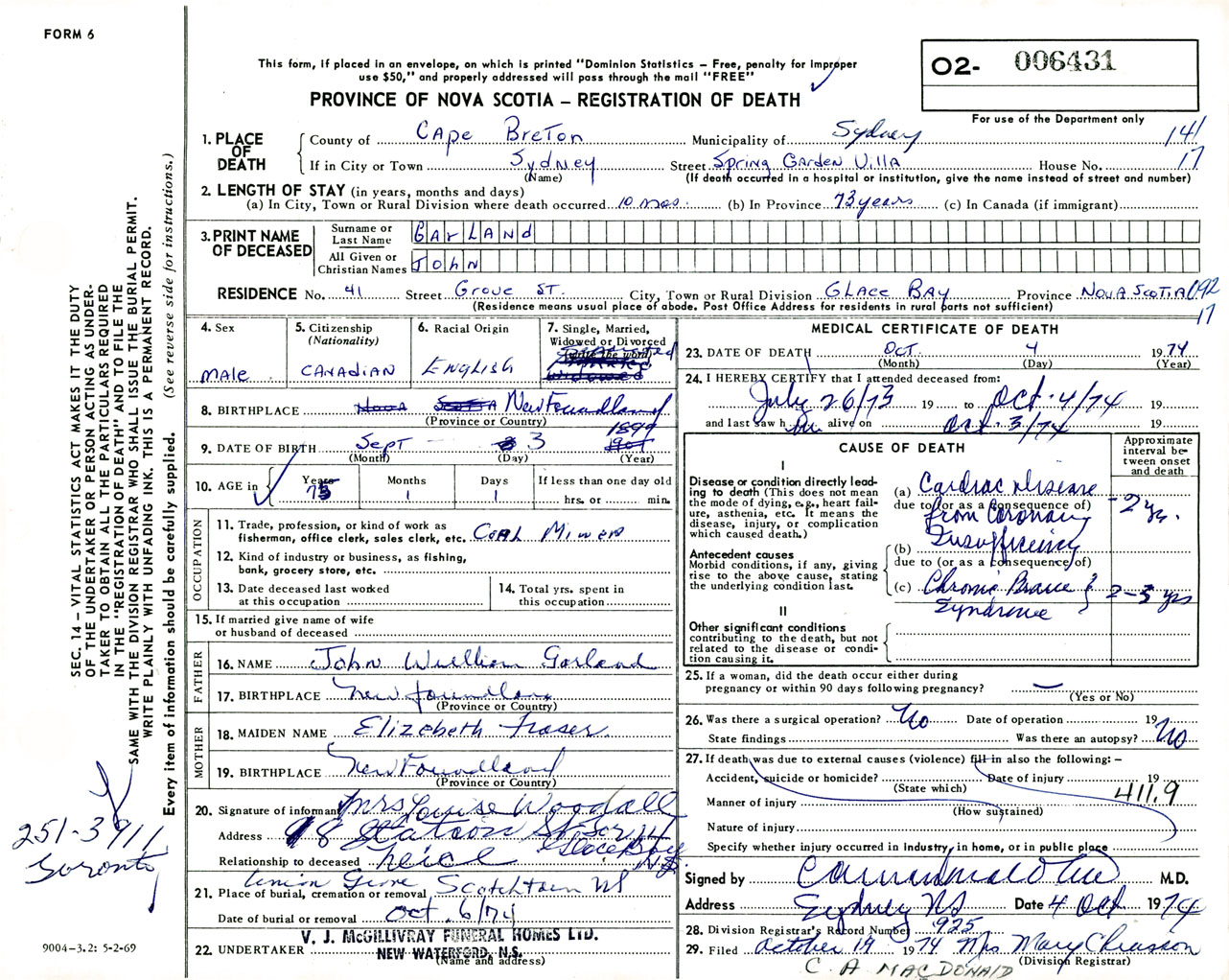 Male Death Registration: Year: 1974 number: 6431
