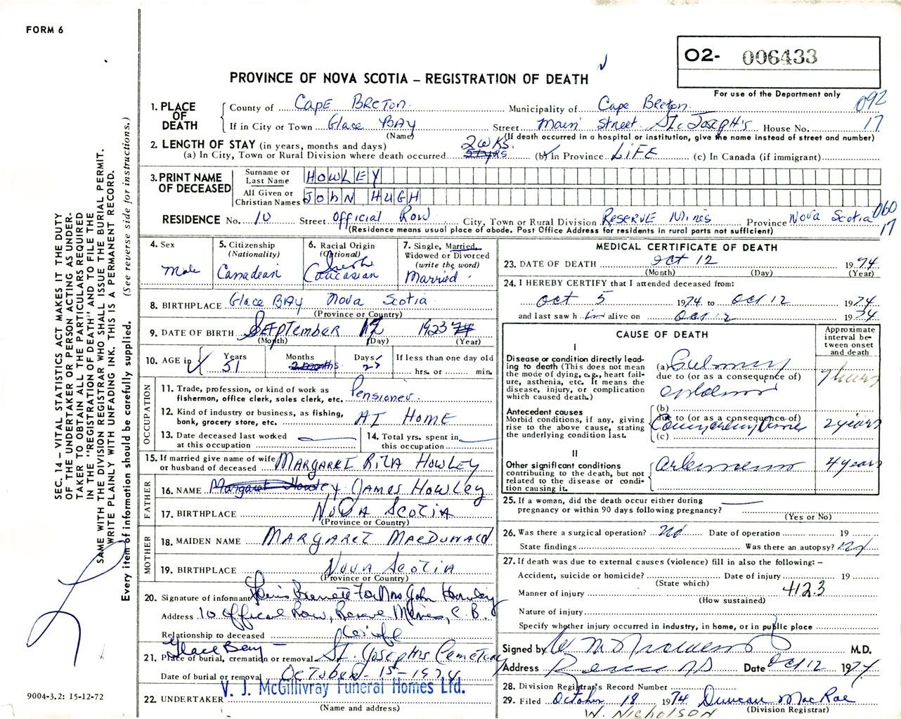 Male Death Registration: Year: 1974 number: 6433