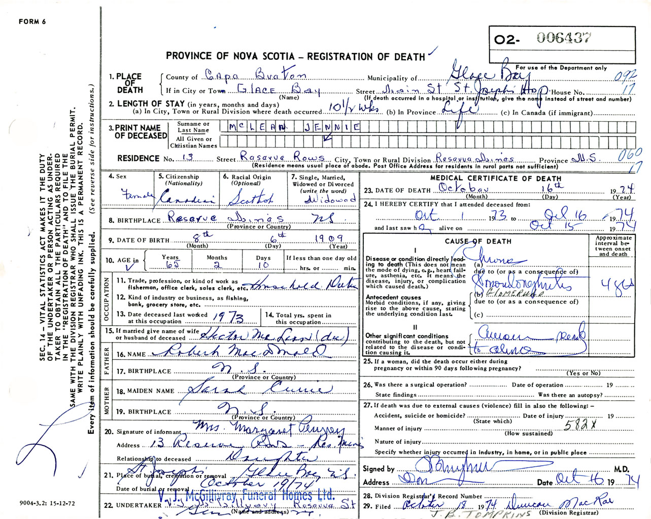 Female Death Registration: Year: 1974 number: 6437