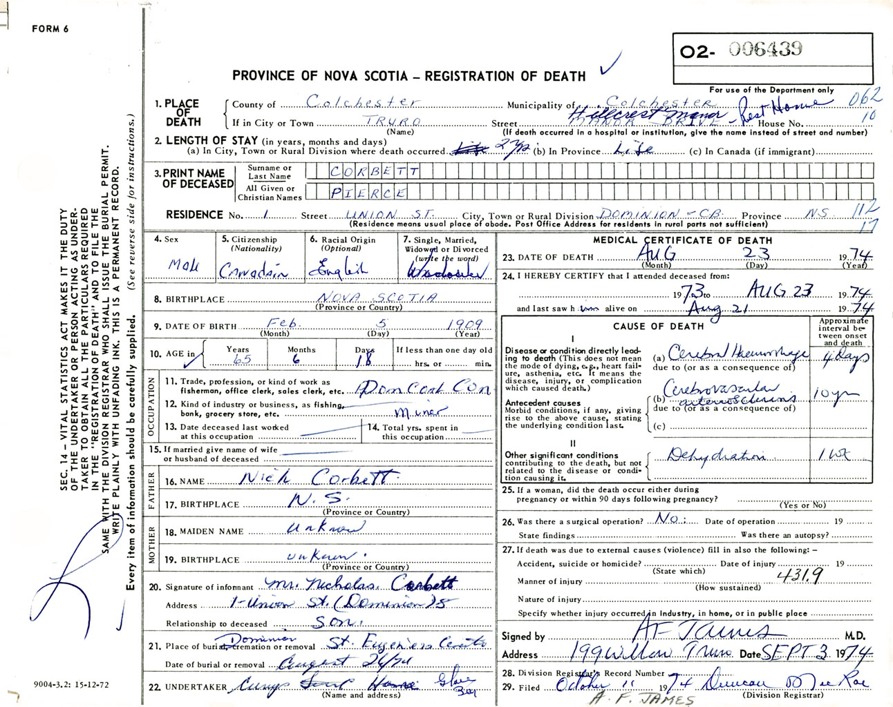 Male Death Registration: Year: 1974 number: 6439