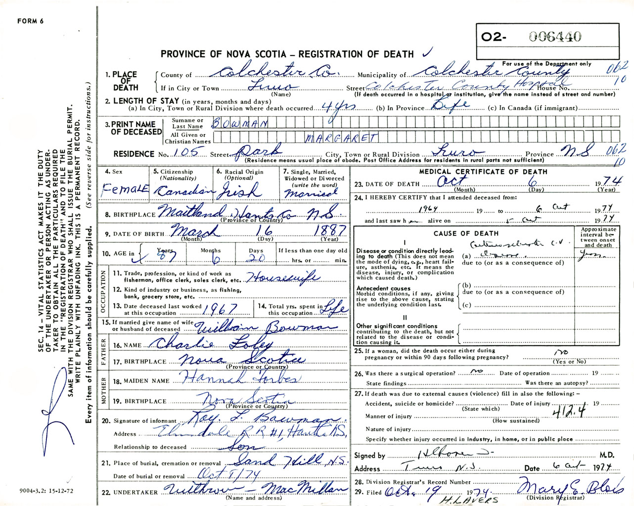 Female Death Registration: Year: 1974 number: 6440
