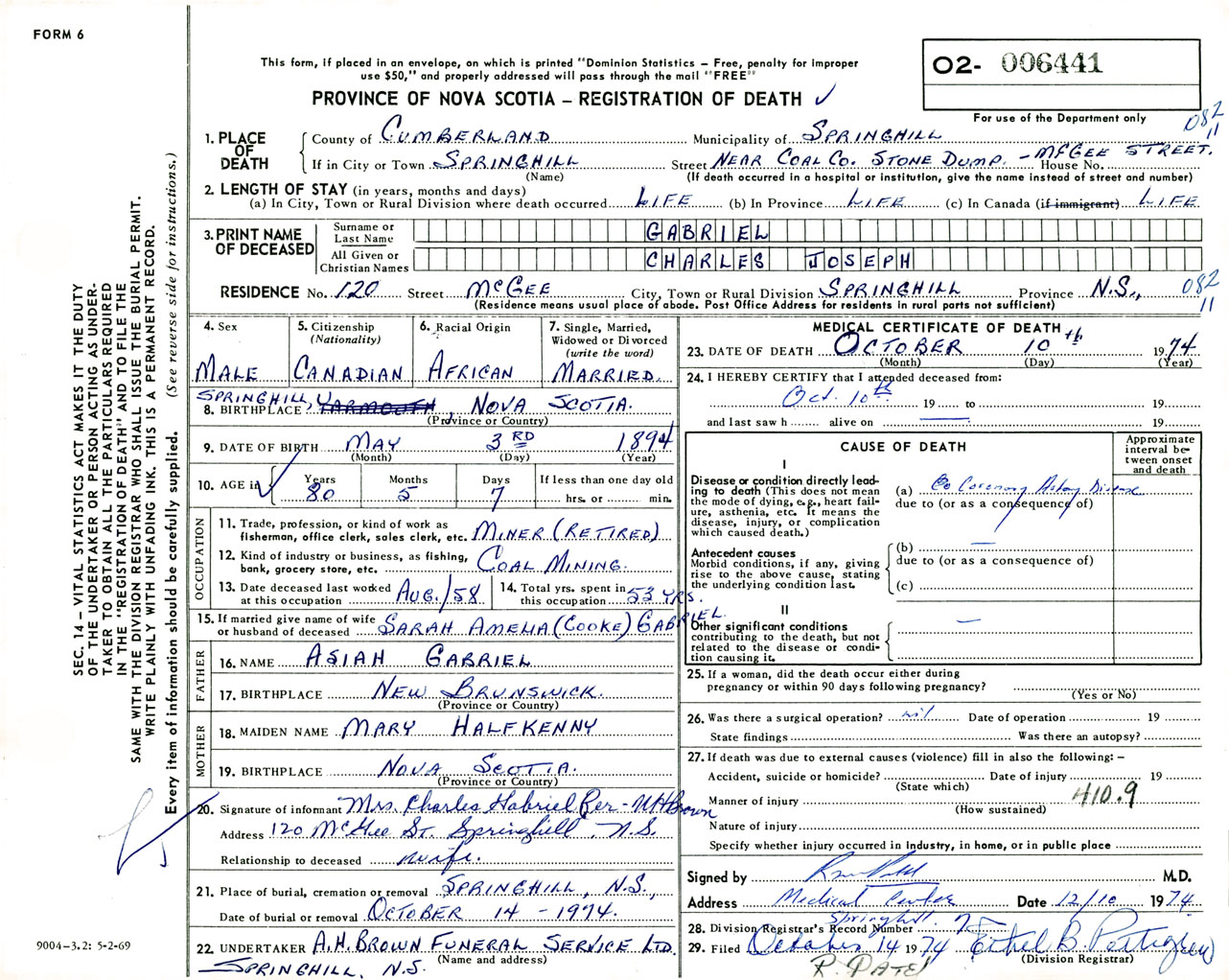 Male Death Registration: Year: 1974 number: 6441