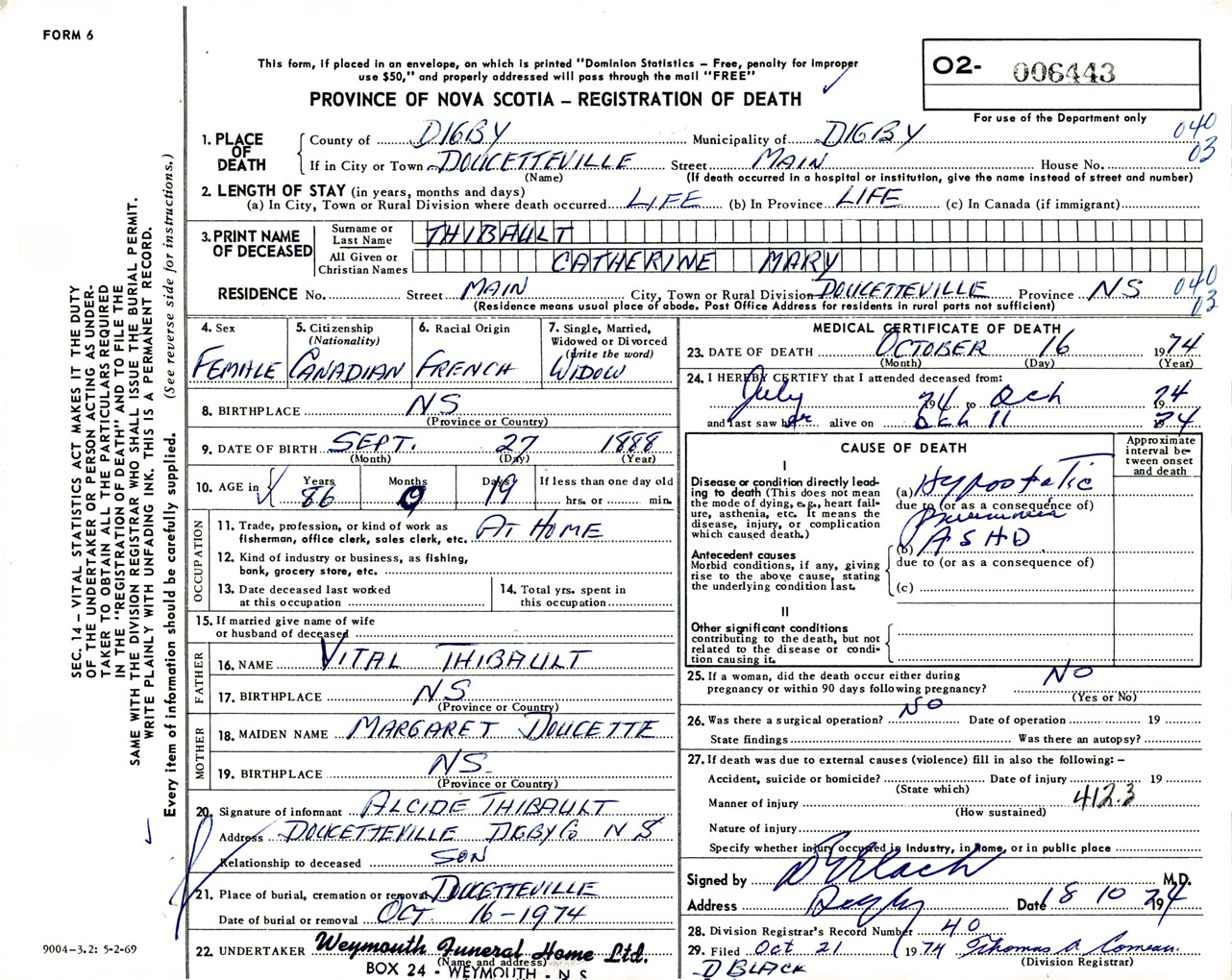 Female Death Registration: Year: 1974 number: 6443