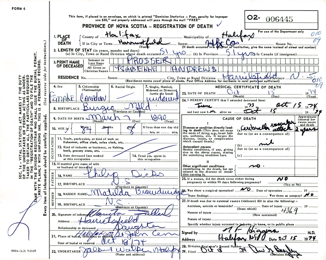 Female Death Registration: Year: 1974 number: 6445