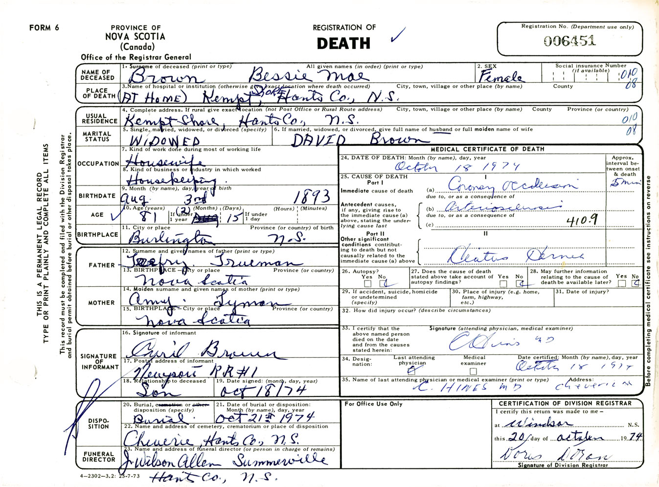 Female Death Registration: Year: 1974 number: 6451