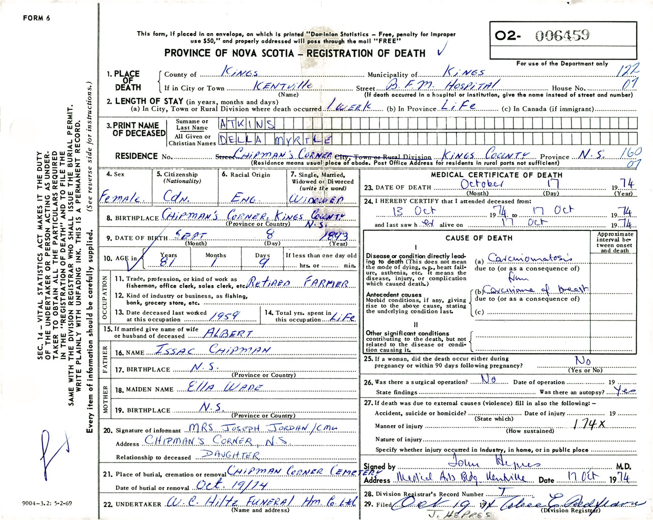 Female Death Registration: Year: 1974 number: 6459