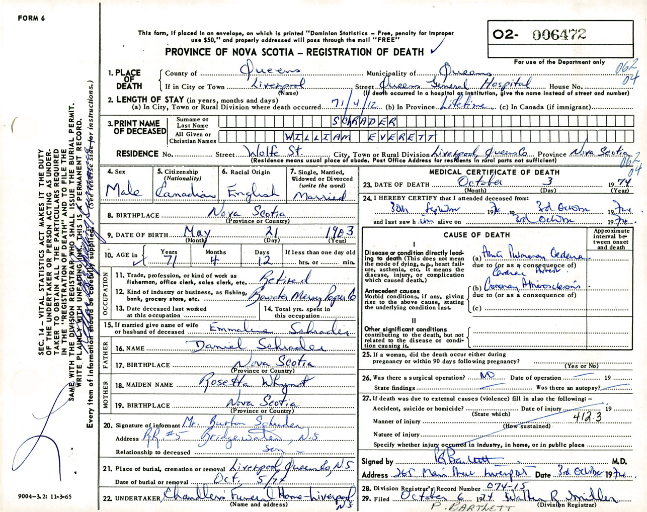 Male Death Registration: Year: 1974 number: 6472