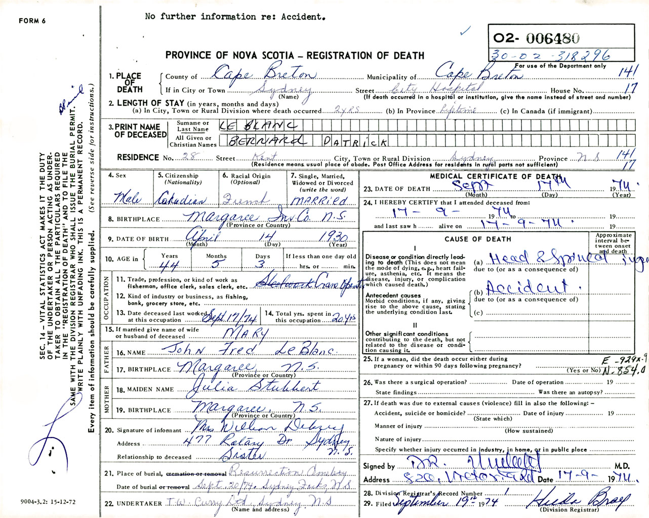 Male Death Registration: Year: 1974 number: 6480