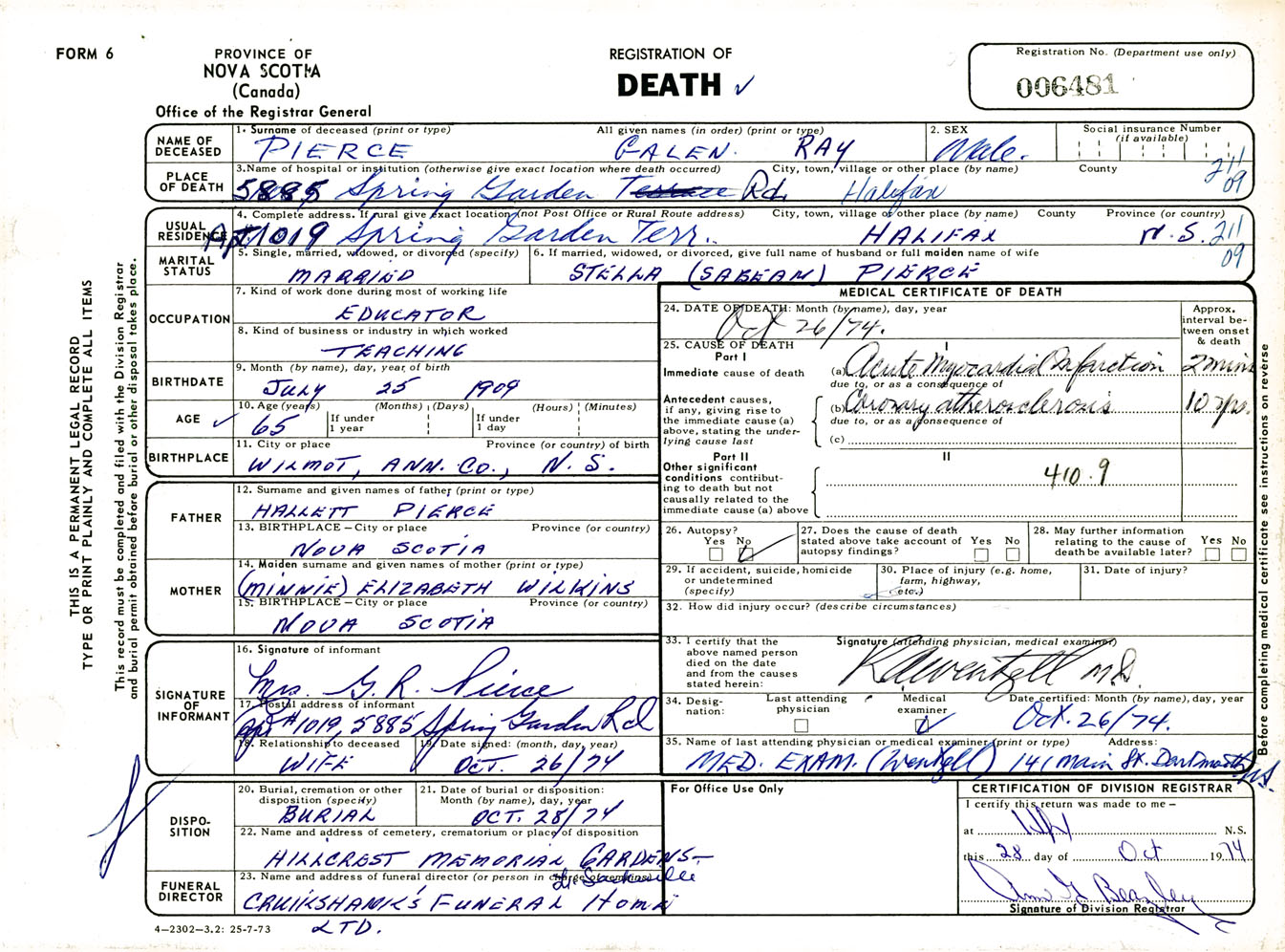 Male Death Registration: Year: 1974 number: 6481