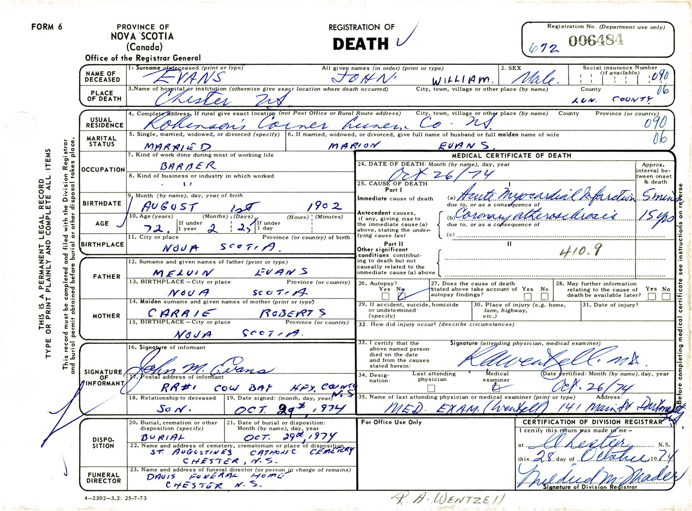 Male Death Registration: Year: 1974 number: 6484
