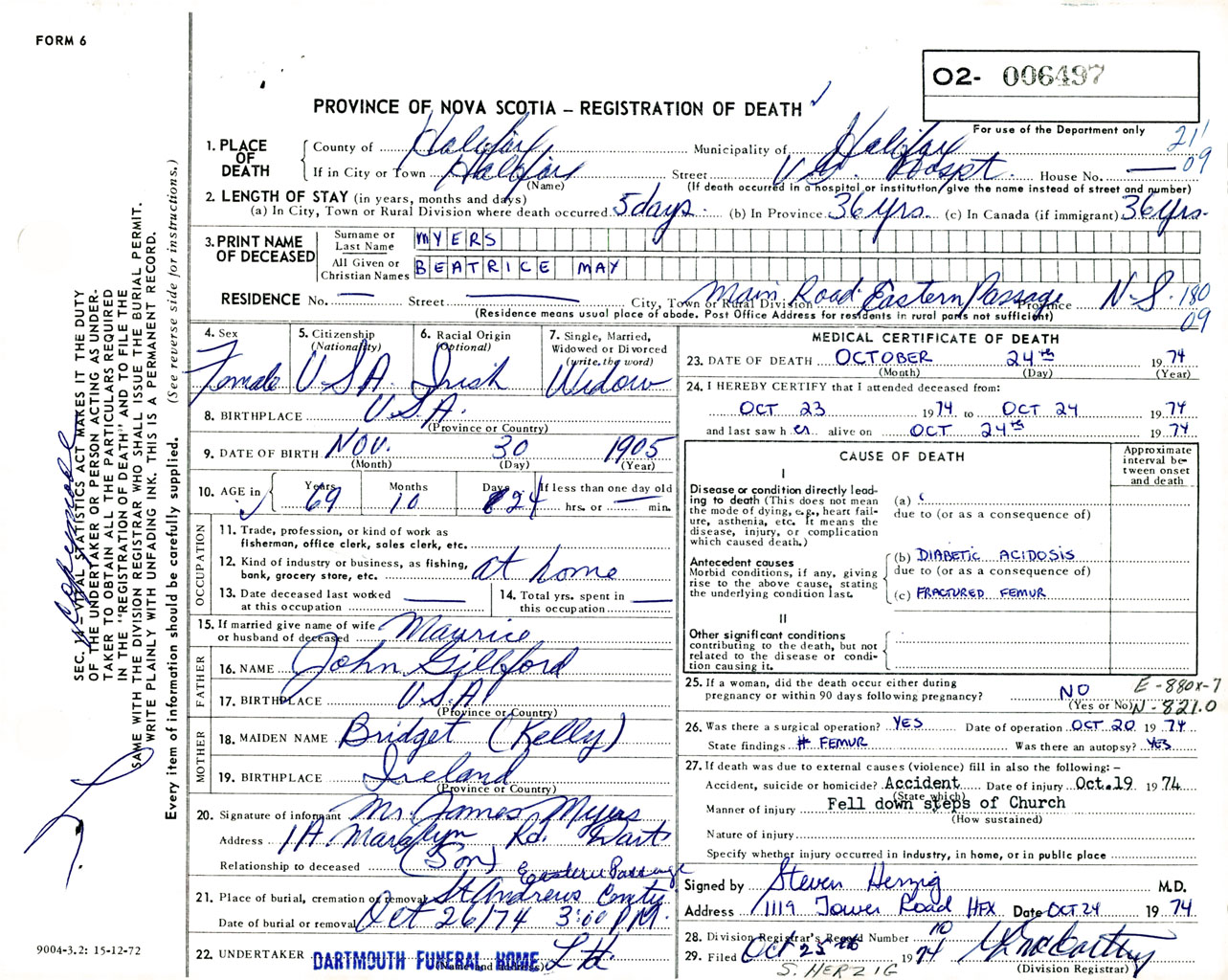 Female Death Registration: Year: 1974 number: 6497