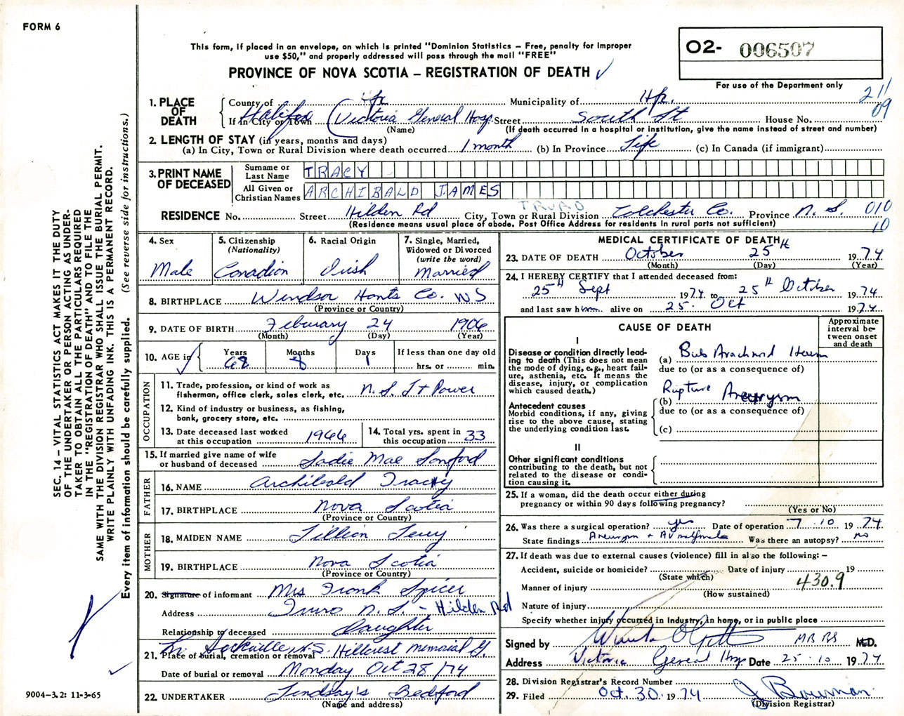 Male Death Registration: Year: 1974 number: 6507