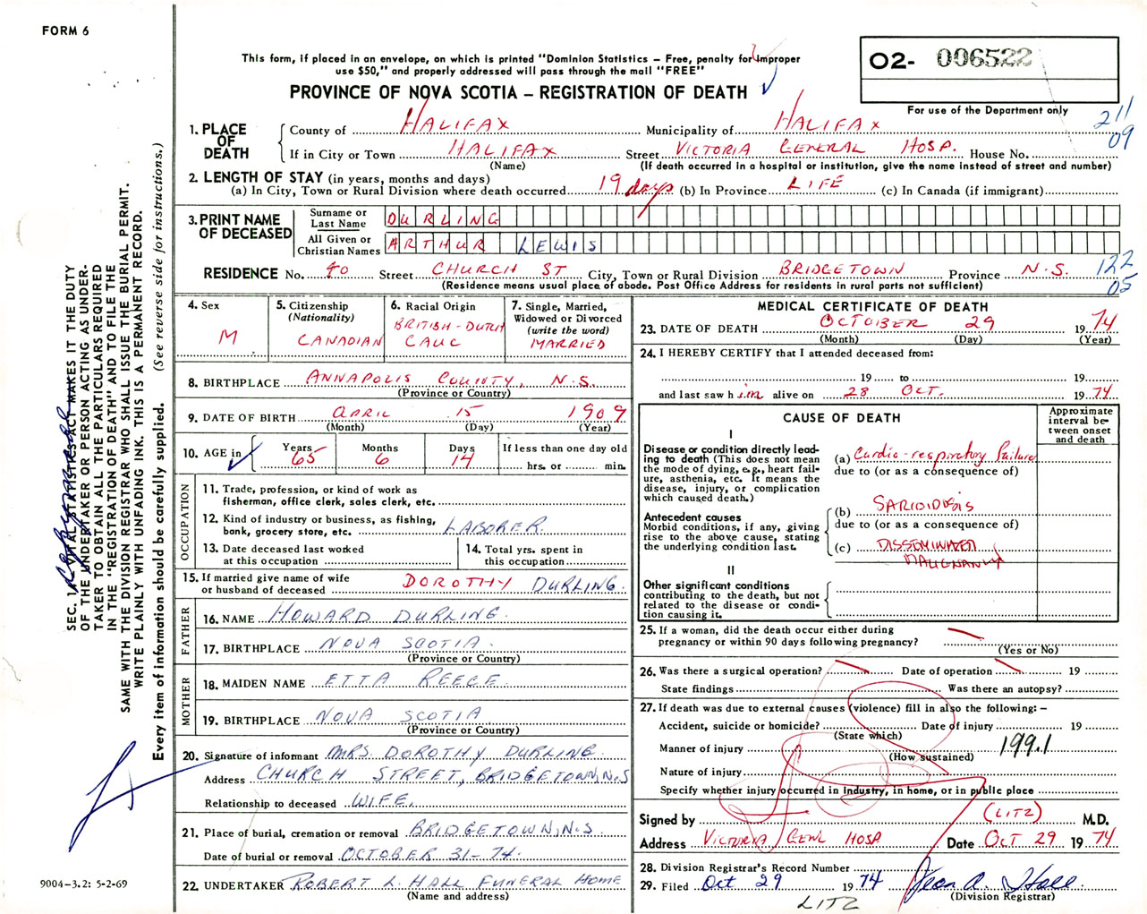 Male Death Registration: Year: 1974 number: 6522