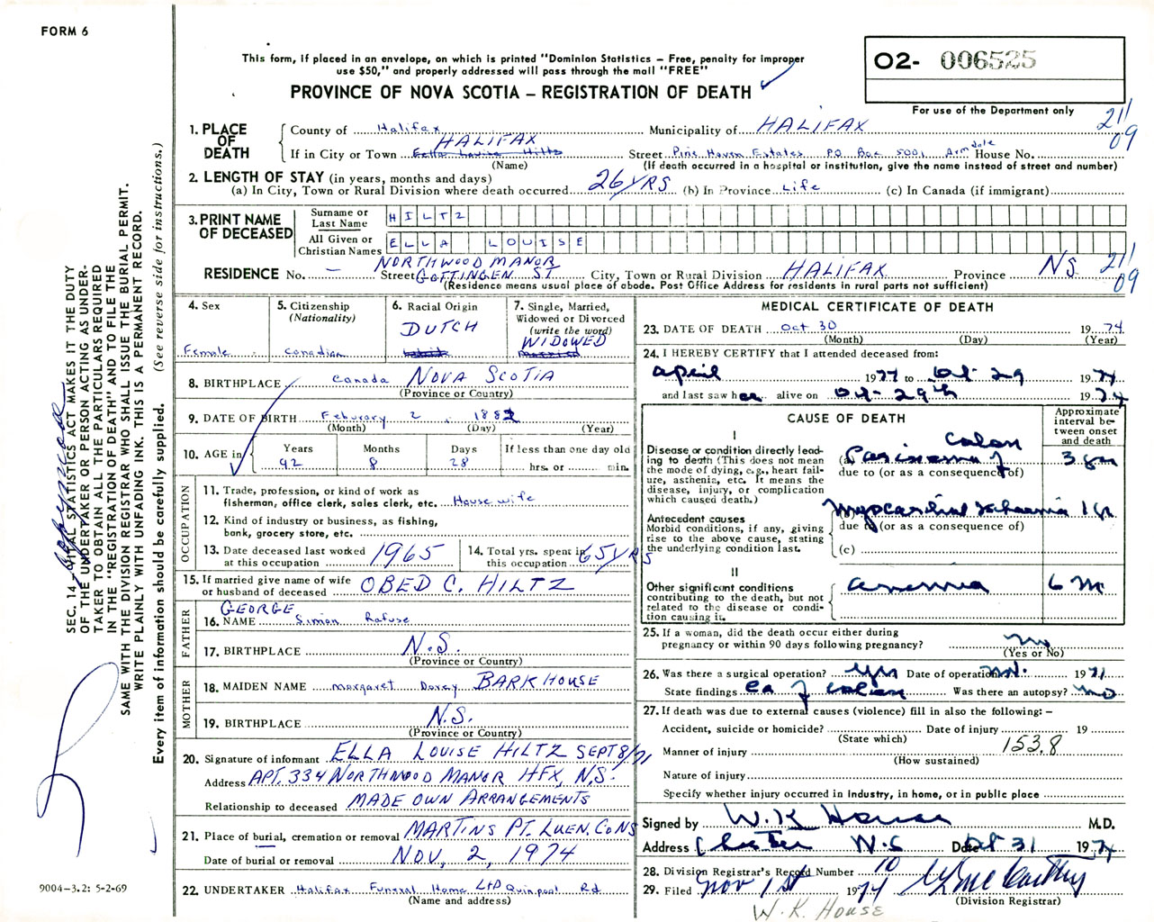Female Death Registration: Year: 1974 number: 6525