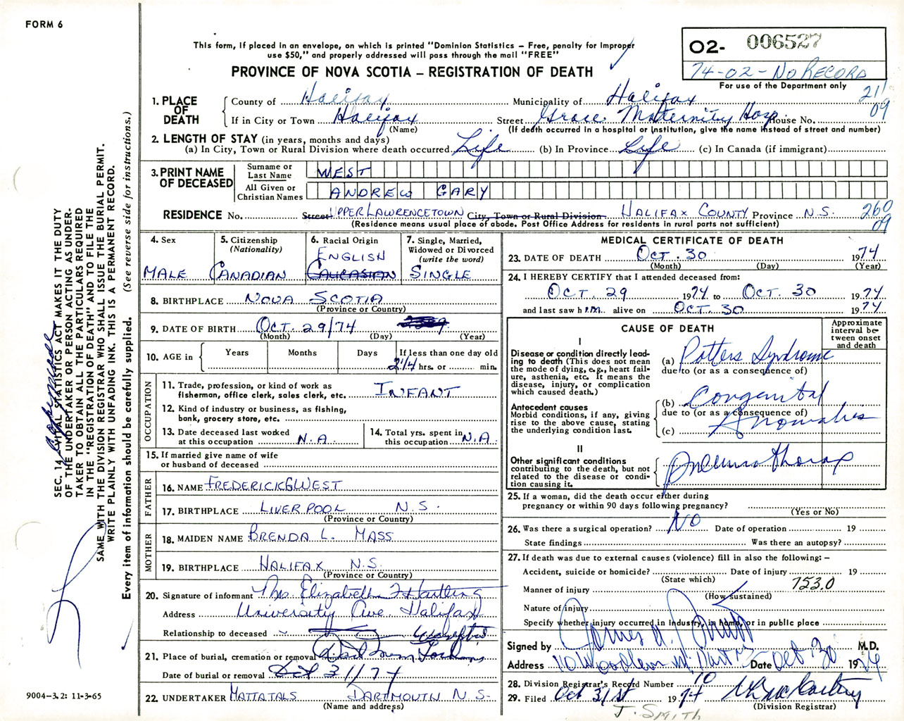 Male Death Registration: Year: 1974 number: 6527