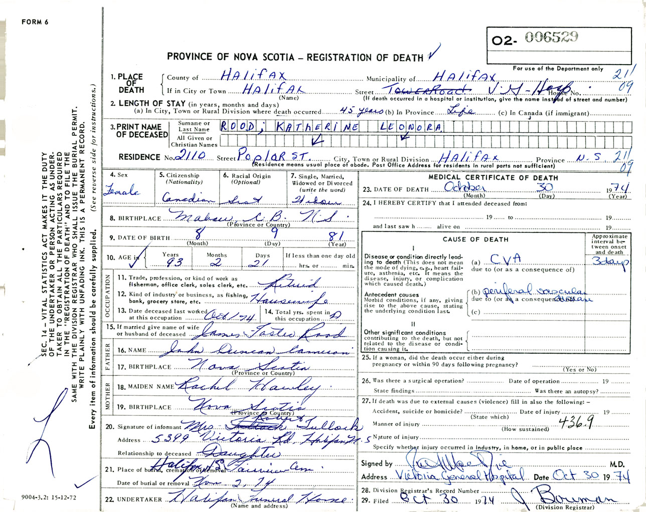 Female Death Registration: Year: 1974 number: 6529