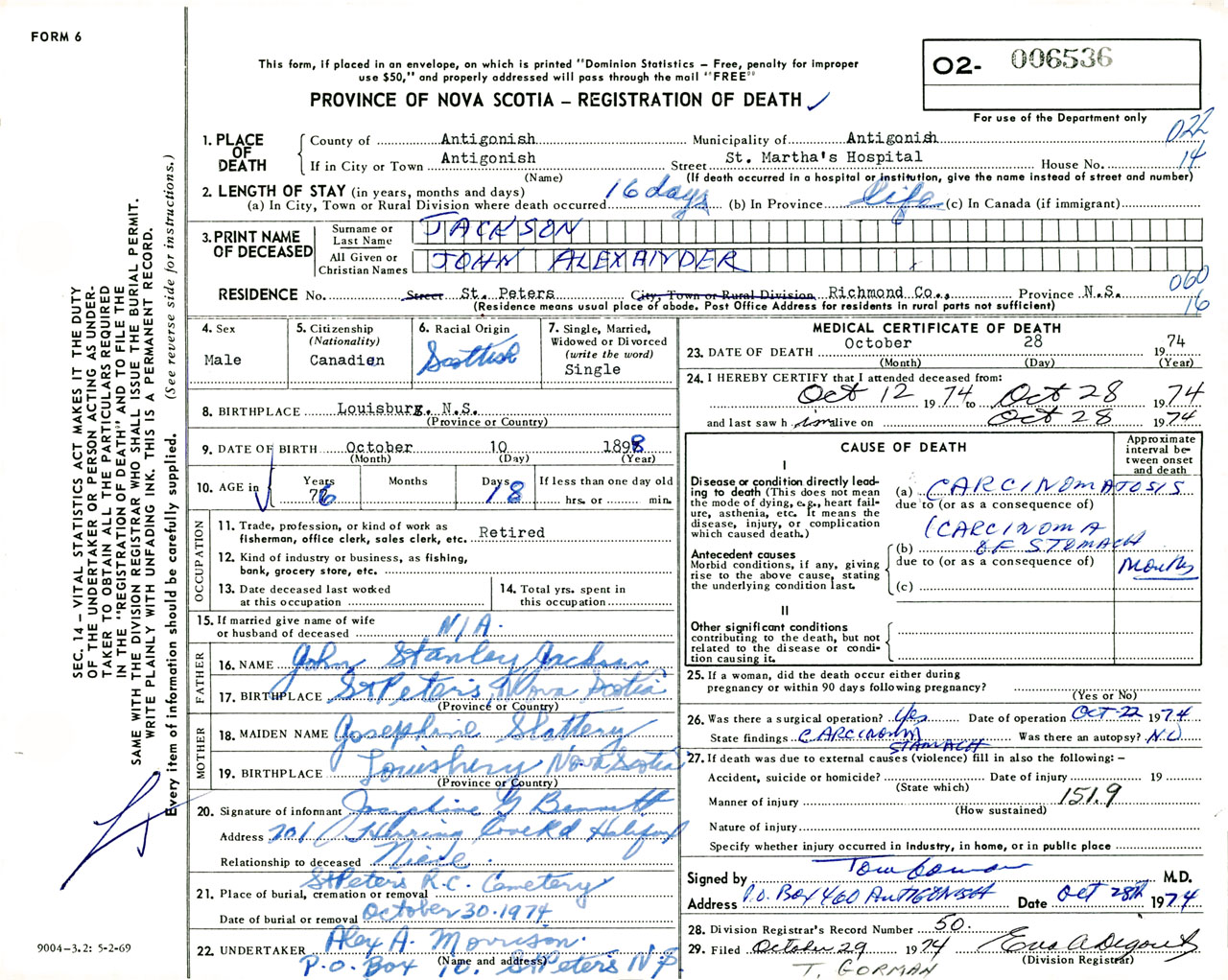 Male Death Registration: Year: 1974 number: 6536