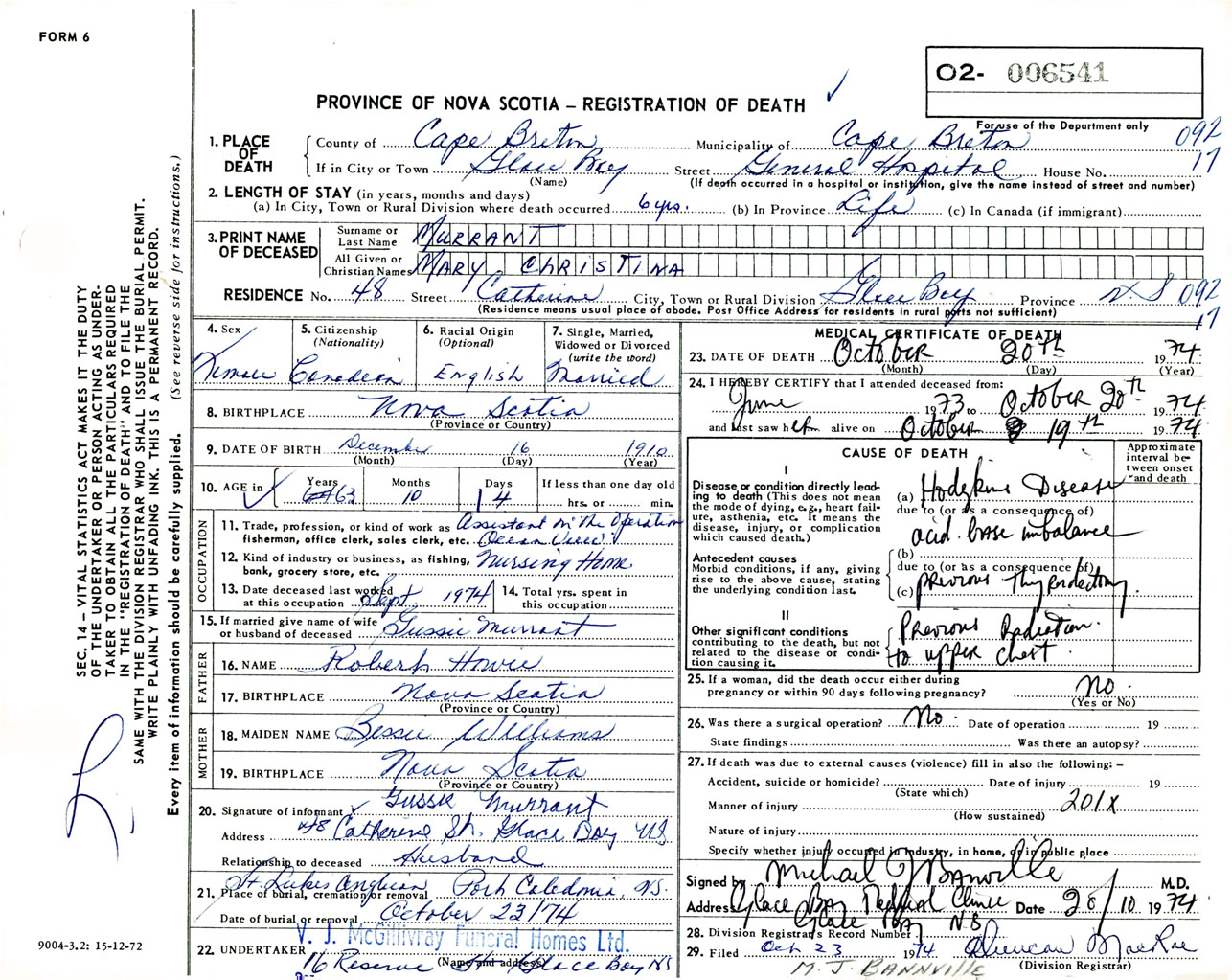 Female Death Registration: Year: 1974 number: 6541
