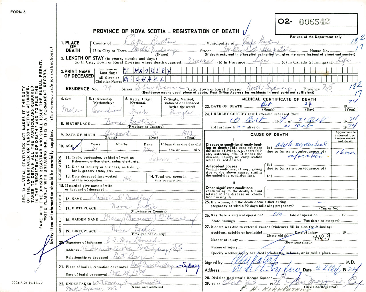 Male Death Registration: Year: 1974 number: 6542