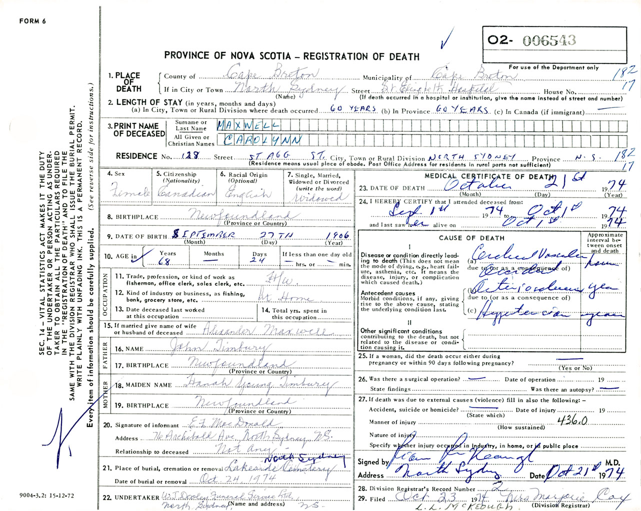 Female Death Registration: Year: 1974 number: 6543