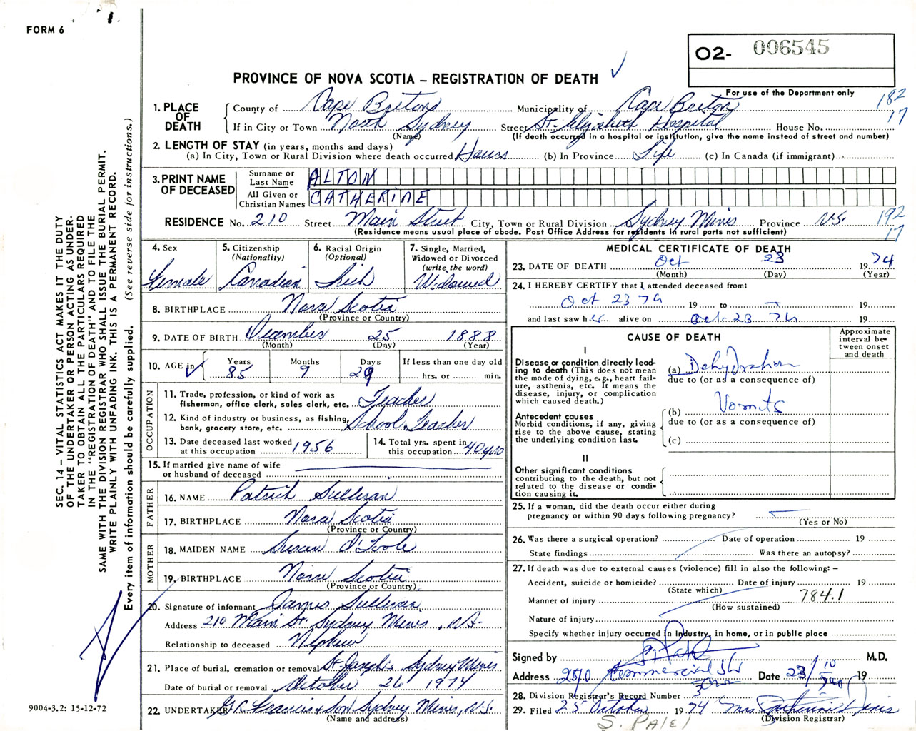 Female Death Registration: Year: 1974 number: 6545