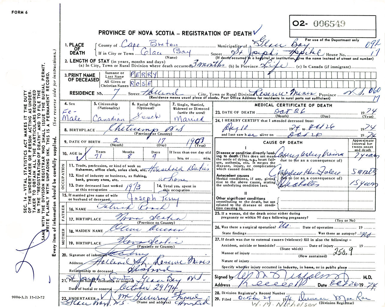 Female Death Registration: Year: 1974 number: 6549