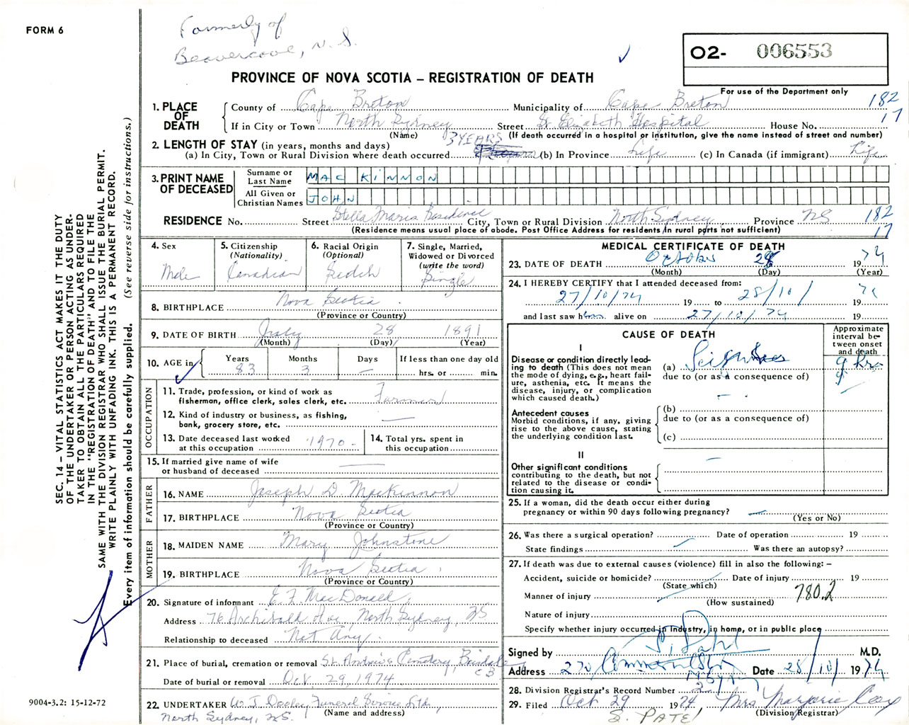 Male Death Registration: Year: 1974 number: 6553