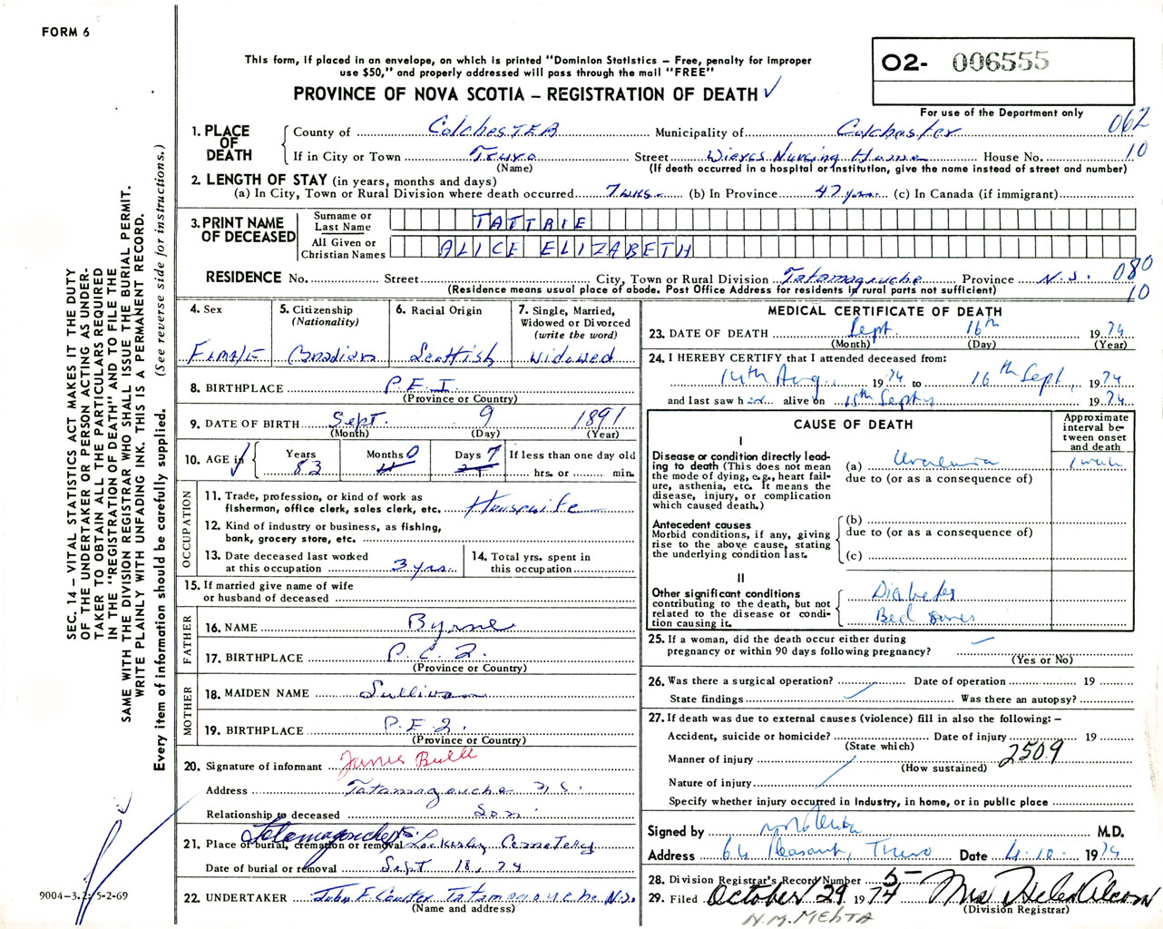 Female Death Registration: Year: 1974 number: 6555