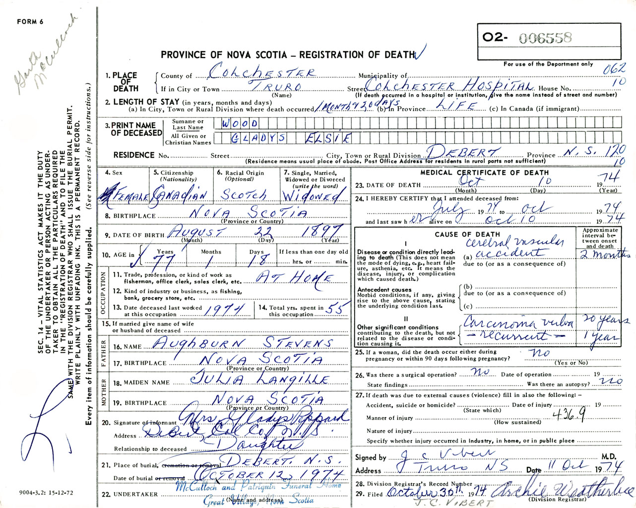 Female Death Registration: Year: 1974 number: 6558