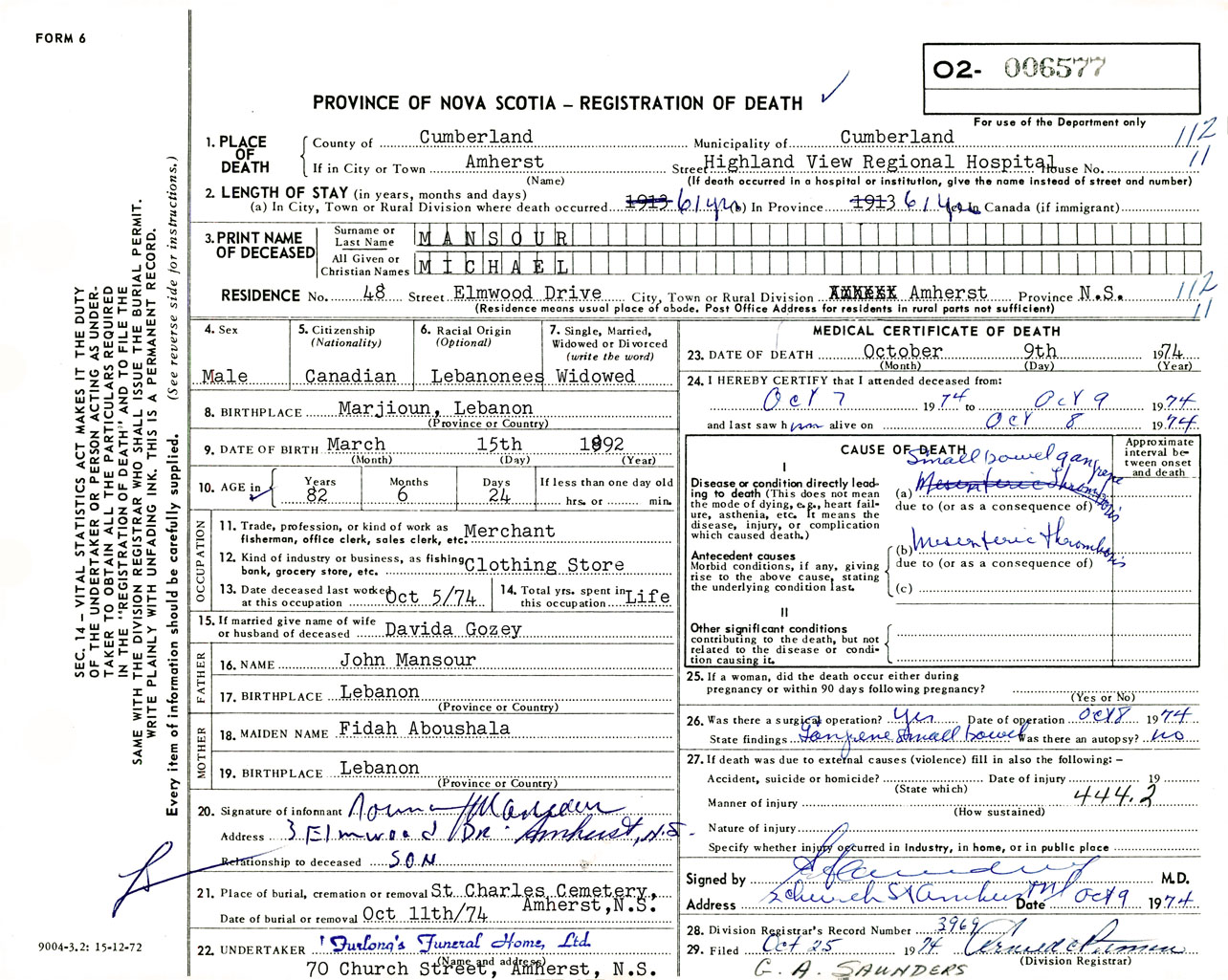 Male Death Registration: Year: 1974 number: 6577