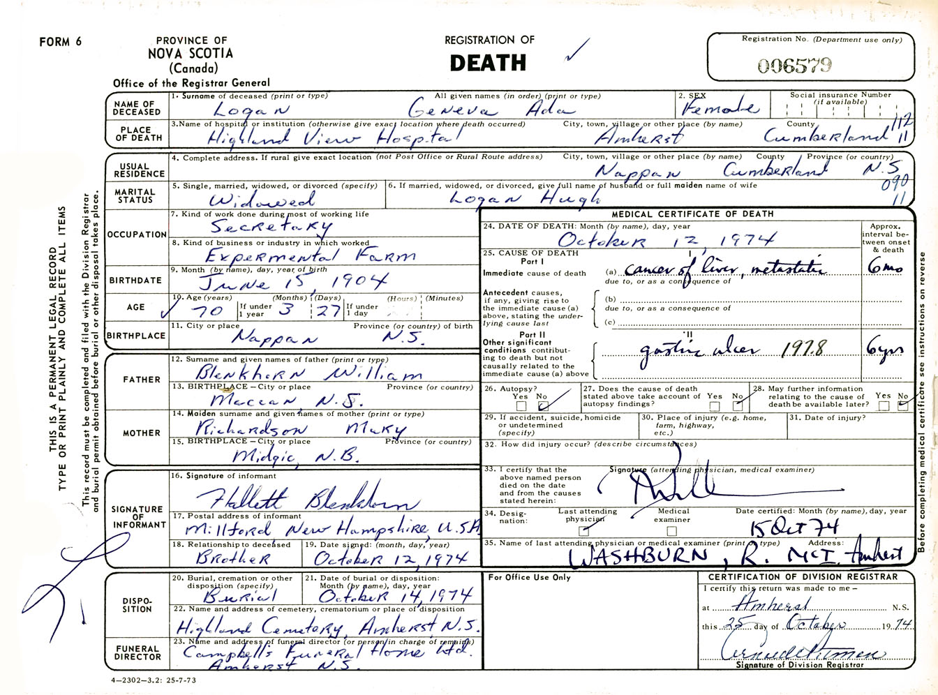 Female Death Registration: Year: 1974 number: 6579
