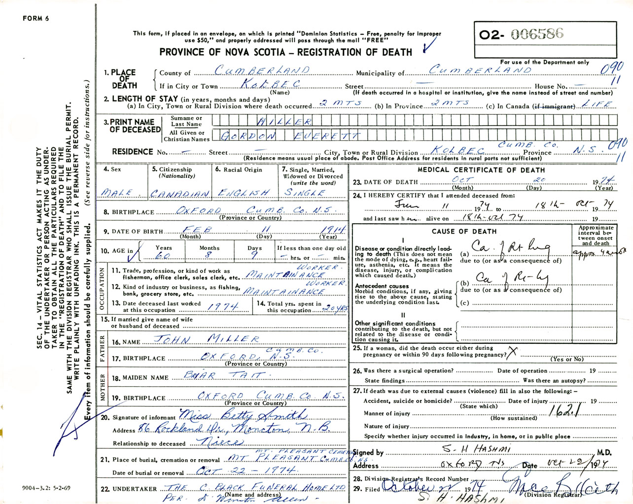 Male Death Registration: Year: 1974 number: 6586