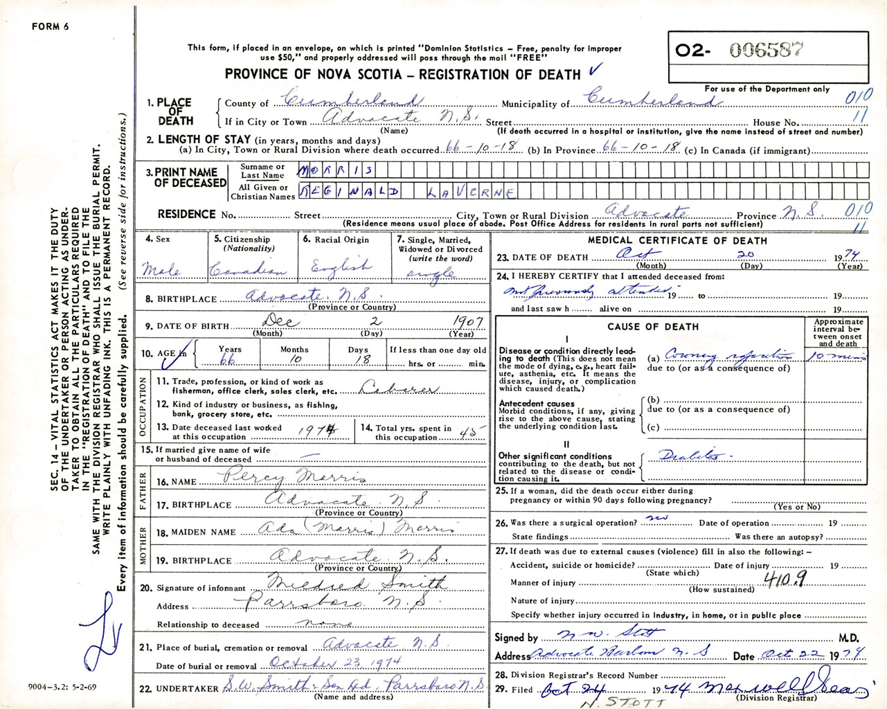 Male Death Registration: Year: 1974 number: 6587