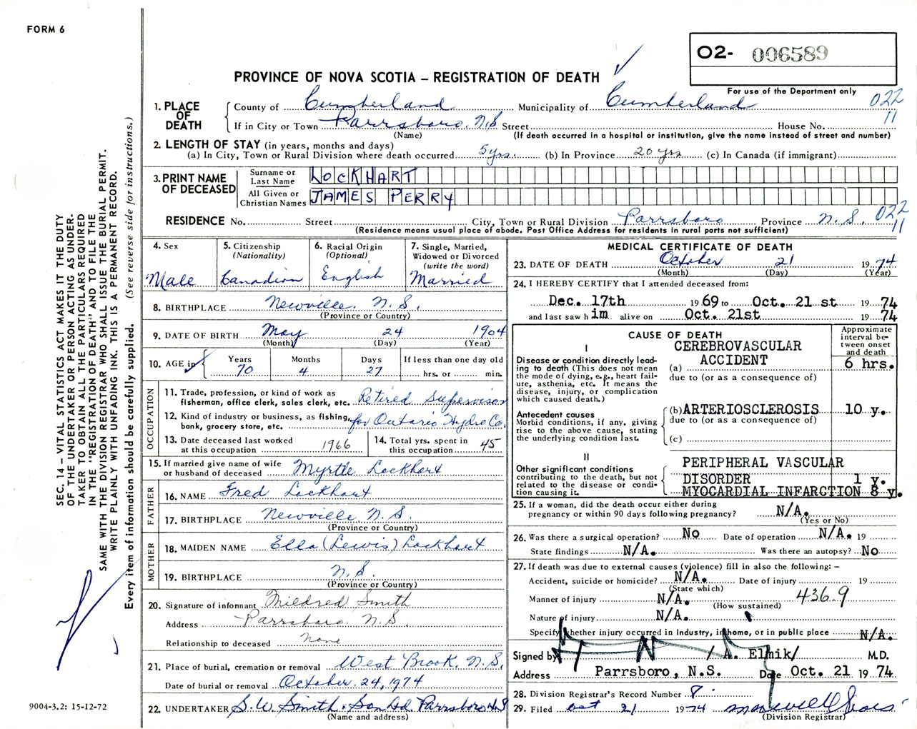 Male Death Registration: Year: 1974 number: 6589