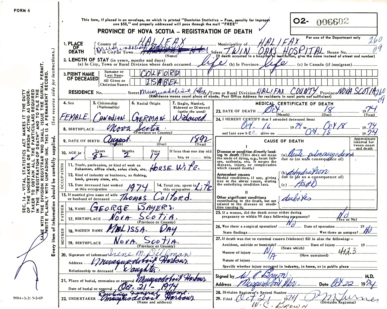 Female Death Registration: Year: 1974 number: 6602