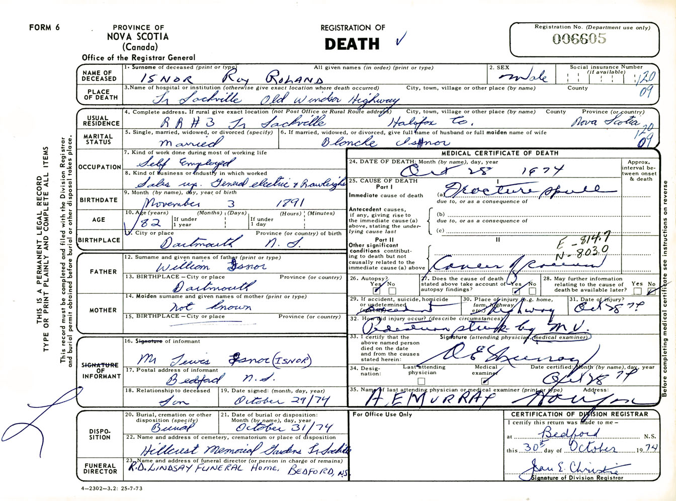 Male Death Registration: Year: 1974 number: 6605