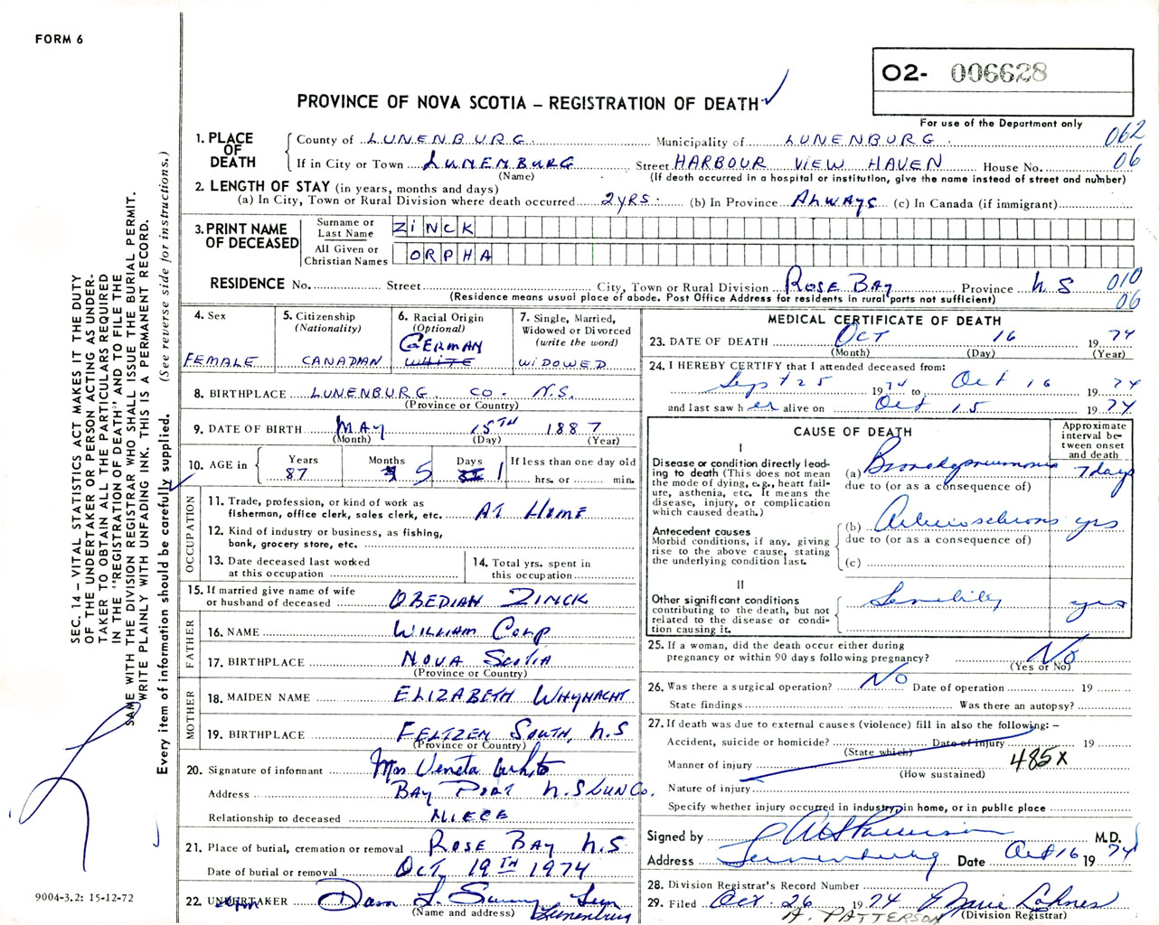 Female Death Registration: Year: 1974 number: 6628