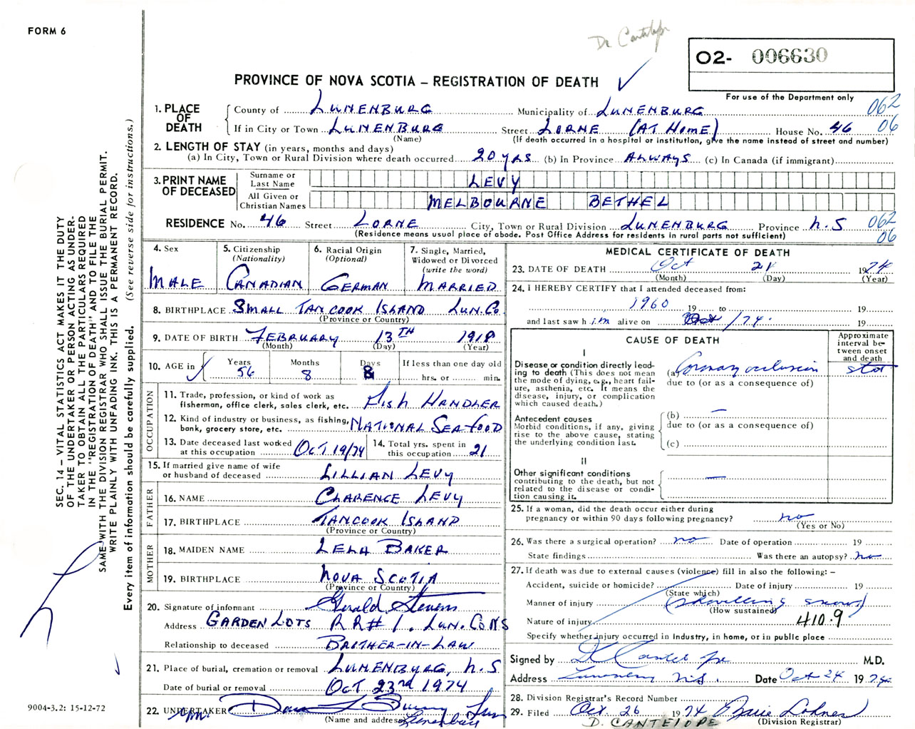 Male Death Registration: Year: 1974 number: 6630
