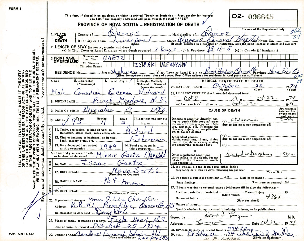 Male Death Registration: Year: 1974 number: 6645