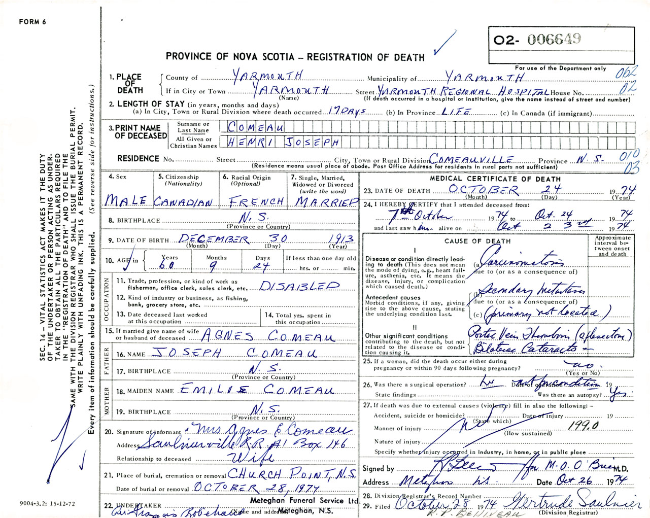 Male Death Registration: Year: 1974 number: 6649