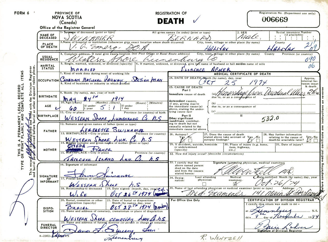 Male Death Registration: Year: 1974 number: 6669