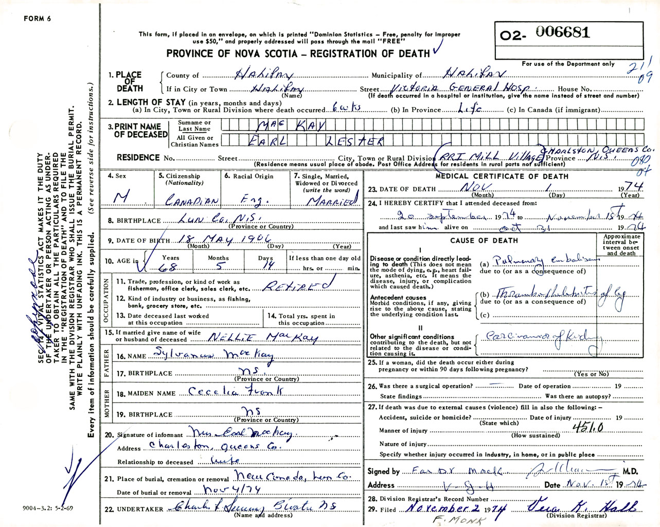 Male Death Registration: Year: 1974 number: 6681