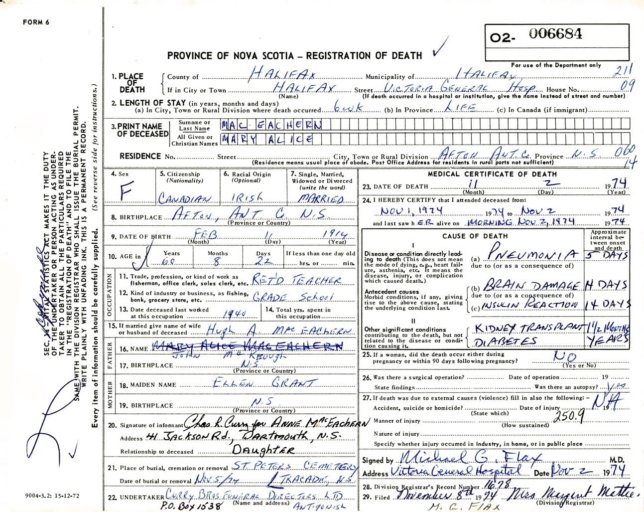 Female Death Registration: Year: 1974 number: 6684