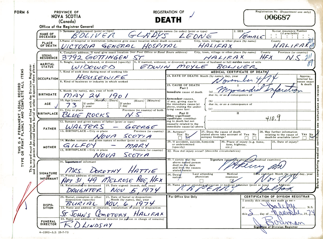 Female Death Registration: Year: 1974 number: 6687