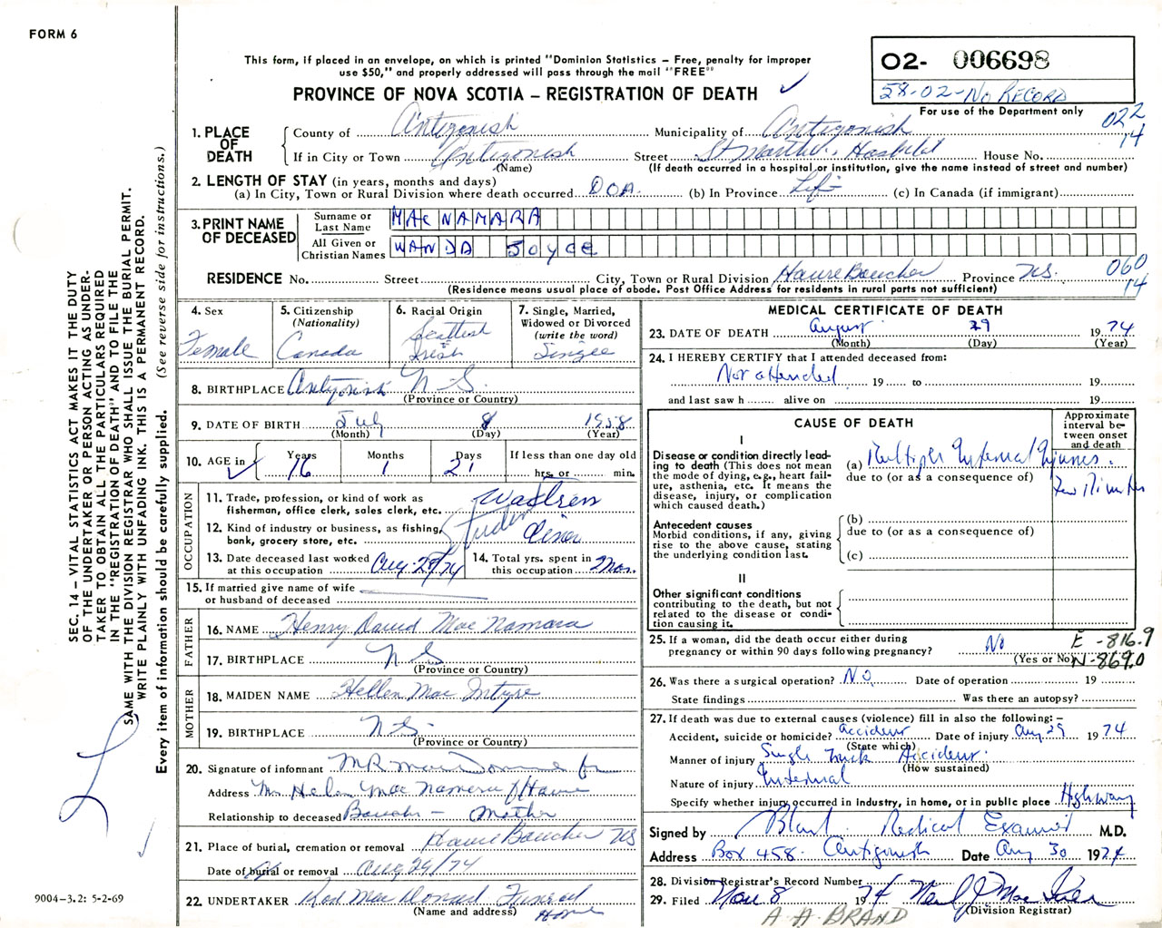 Female Death Registration: Year: 1974 number: 6698