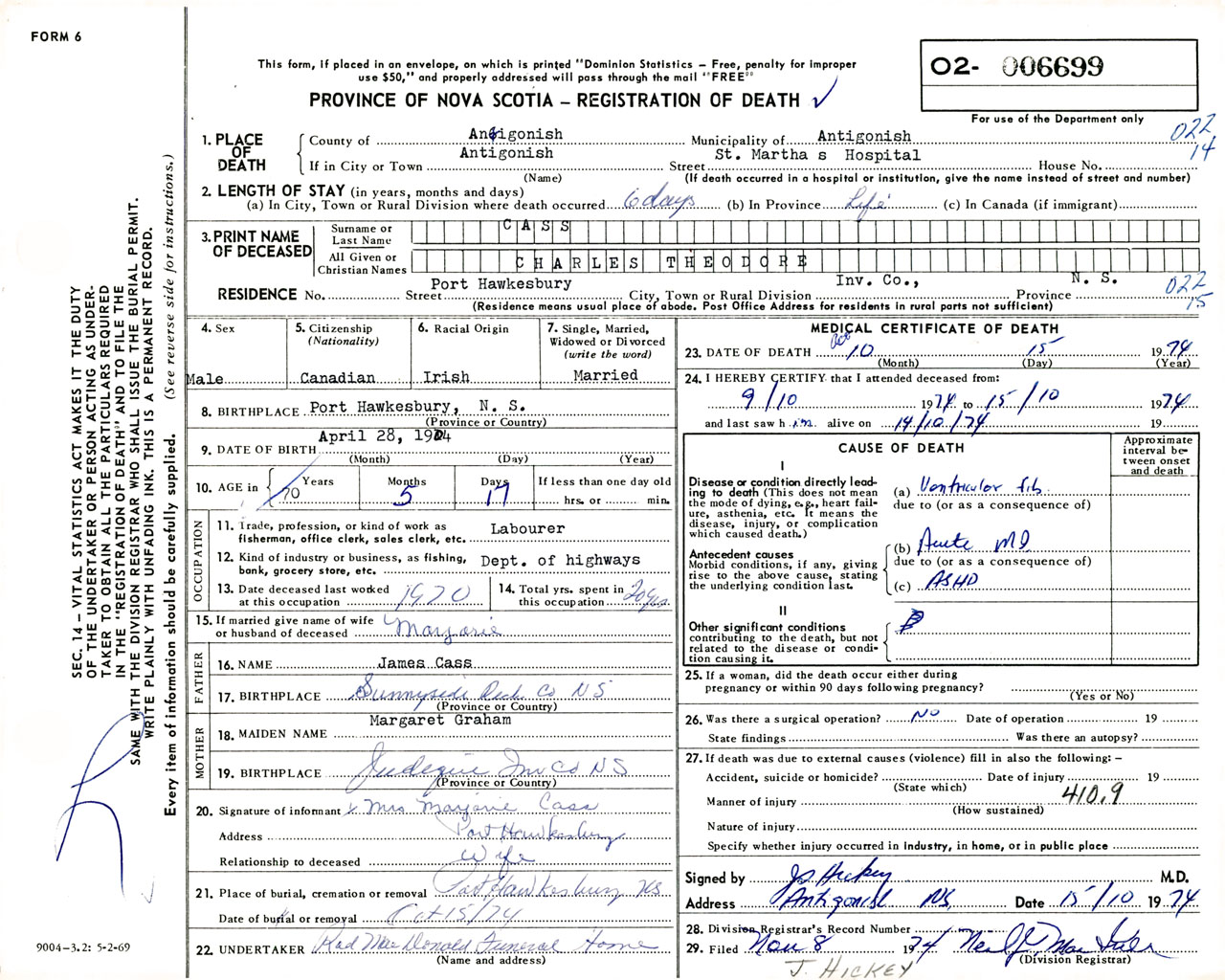 Male Death Registration: Year: 1974 number: 6699