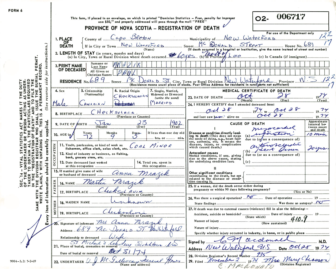 Male Death Registration: Year: 1974 number: 6717